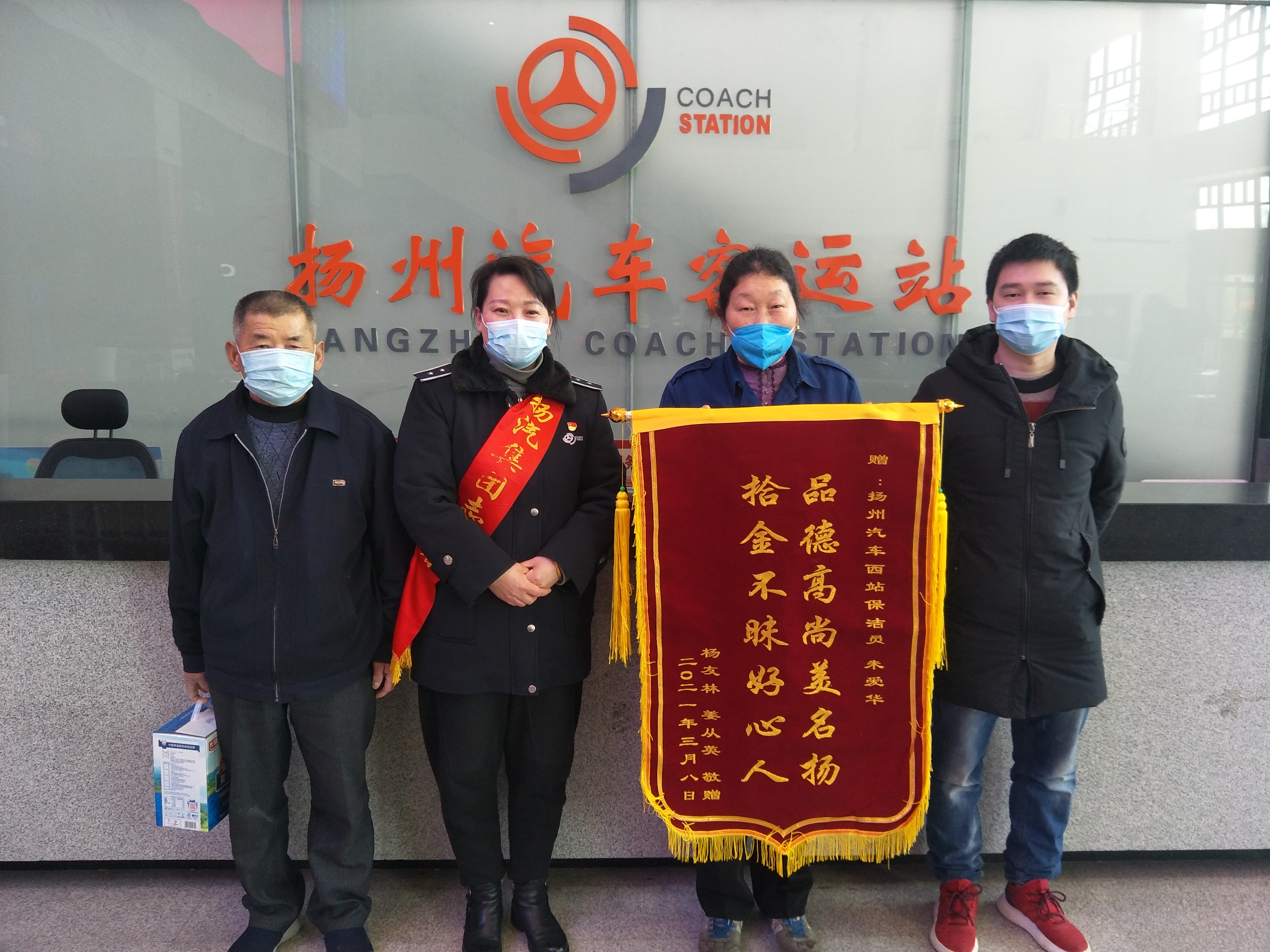 “品德高尚美名揚,拾金不昧好人心”,3月22日上午,揚州汽車站收到一面來自旅客的錦旗,對車站保潔員朱愛華拾金不昧的品德和工作人員熱情周到的服務表示了高度贊揚和誠摯感謝。