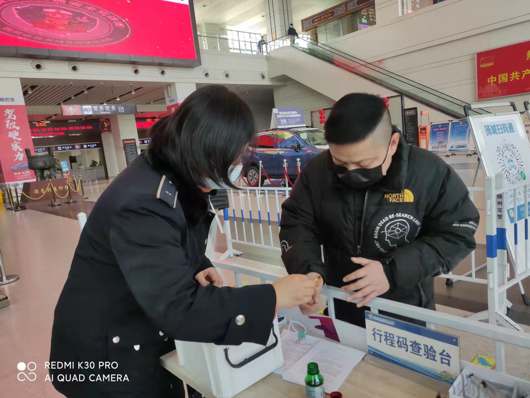 下午一點半,揚州汽車站售票大廳門口,正在認真查驗行程碼的劉揚,看著對面遞身份證過來的一雙手,手上傷痕累累,手里握著一團紙巾,紙巾上血跡斑斑,于是關切地詢問起來。經詢問得知,原來旅客于先生是常州人,在揚州出差三天了,估摸著今天的工作能夠忙完,想早點趕回常州,工作一結束,便從工作地點騎公共電動車來揚州汽車站乘車,誰知一個不小心,摔了一跤,羽絨服破了,手機摔壞了,兩只手也蹭破了好幾處,血不停地淌。